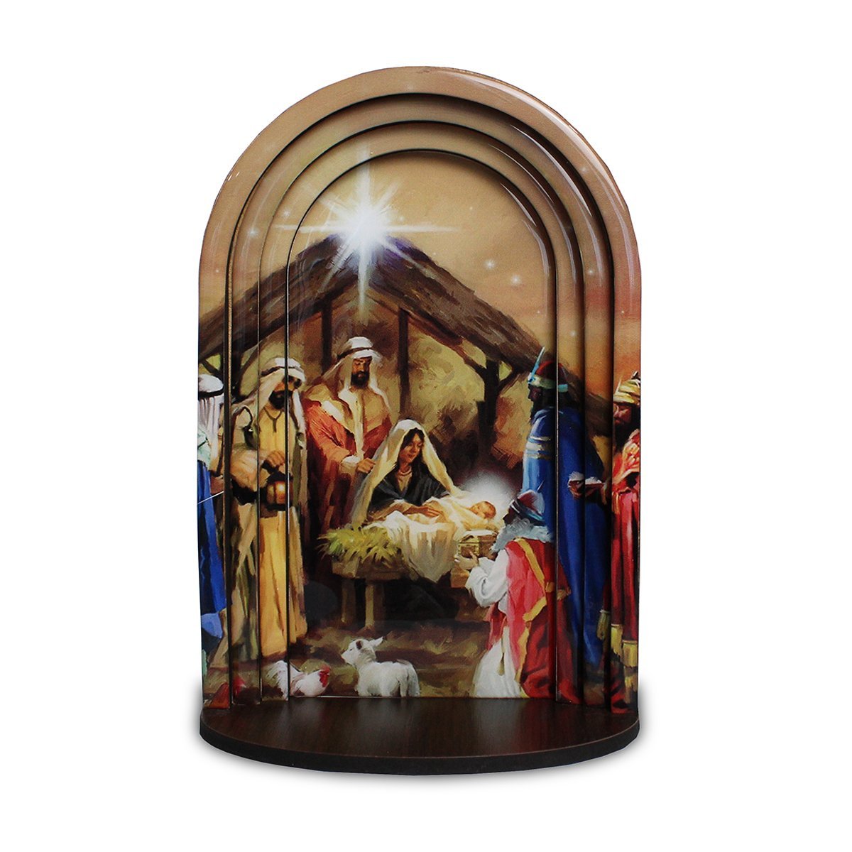 Capela produzida em MDF 6 mm, com imagem do Presépio Reis Magos resinada, efeito de profundidade devido ao posicionamento do MDF