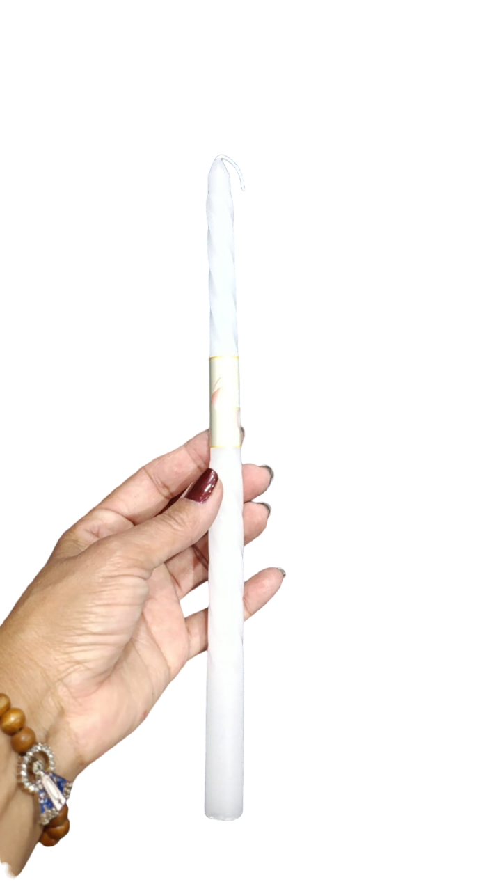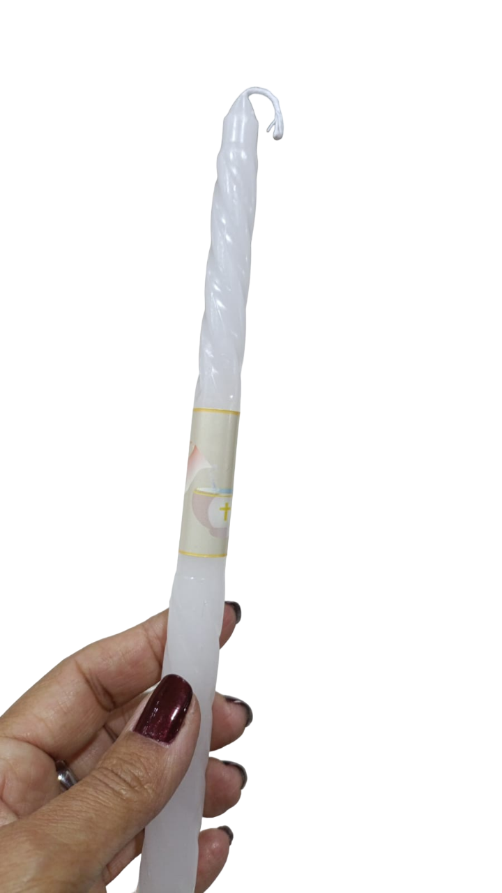 Vela de parafina, modelo torcida com adesivo temático Batizado. A vela é usada durante a cerimônia do Batismo Possui as seguintes medidas, 30cm altura e 1,5cm de diâmetro.